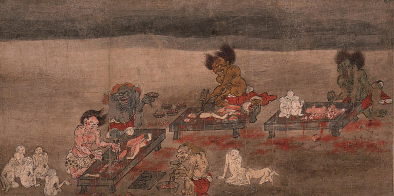 ここは、動物を殺して皮を剥いだりした僧侶が堕ちる地獄らしい。当時の僧侶に、そういうことをして皮を利用したり売ったりする輩がいたのであろうか。鬼たちが肉ごと背中の皮を剥ぎ、僧侶たちは血まみれで肋骨を露出させてうつ伏せに倒れている。なかなか凄惨な描写である。