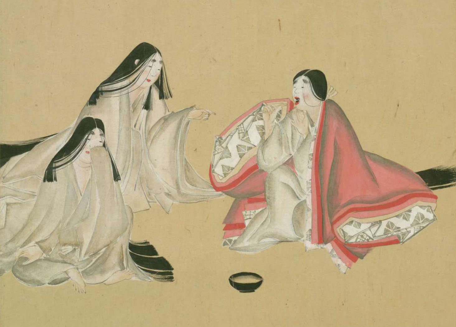 宮仕えの女3人がいる。右が問題の口臭がひどい女で、歯を磨いている。左の2人が臭い臭い、ってやっている。詞書には