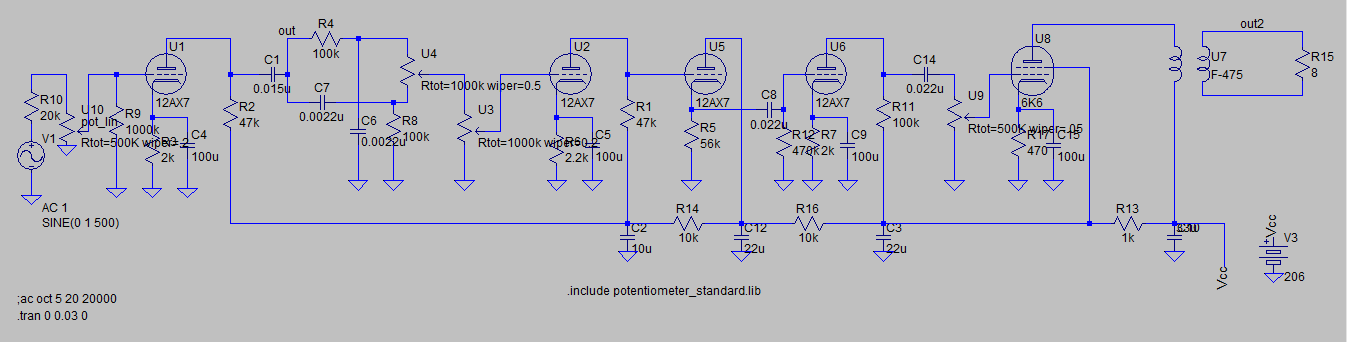 前回でLTSpiceで真空管アンプのシミュレーションをする方法を書いたけど、今回は、実際のギターアンプの回路で、エレキギターの音をシミュレーションした結果を載せておく。あんまり時間ないんで、解説は後にして、取りあえず結果だけね。