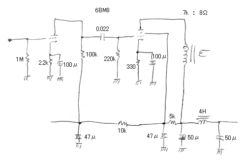 回路は次の通りで、別になんということもないそのへんに転がっている6BM8の推奨回路をそのまま使っている。
