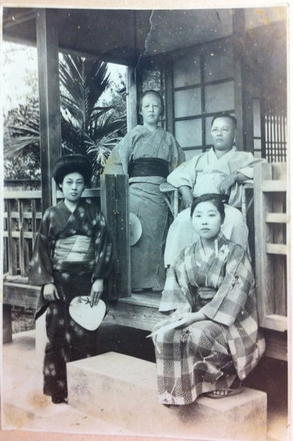 まず、右奥の肘掛け椅子みたいなのに、ものすごく偉そうに座っているのが親父の父親、つまりオレの祖父。で、右手前の若い女性がオレの祖母で、このときはまだ17歳だ。それから、まんなかの奥に立っているものすごく怖そうなおばあさん、あと、左手前にいるやっぱりものすごく怖そうな女性の二人は、誰だかわからないんだが、顔の面影から判断するに、たぶんおばあさんは祖父の母親、で、女性は祖父の妹か姉、だろうな
