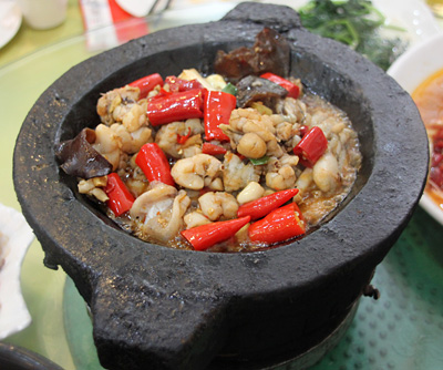 こちらはカエルのぶつ切りの石焼煮。例のあまり辛くないトウガラシと一緒にぐつぐつと煮え立って出てくる。美味。