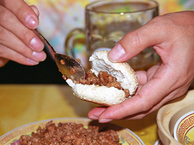 最後はこれも有名な北京の古い料理で、焼餅(シャオ・ピン)と炒肉末(チャオ・ロウ・モウ)である。まんべんなく白ゴマをまぶして焼き上げた焼餅に、豚肉をショウユ味で炒めたそぼろをはさんで食べる。