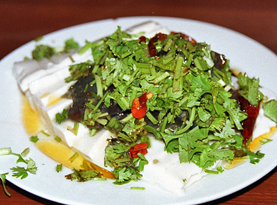 これはピータン豆腐。実は、ここに至って、これら老北京のそっけない料理きわまれりという感じがして、だんだんノリが分かってきた感があった。日本の絹ごし豆腐に相当する柔らかい豆腐を5ミリ幅ぐらいに切って、ピータン、干し蝦、ネギを乗せて、そこにトウガラシの香りを移した油がかかっていて、最後に香菜がたっぷりと乗っている。ウェイターのあんちゃんは中国らしいノリでお皿をテーブルにダンッと置いたせいで豆腐がグニャっとかたよって雑なもんだが、これは、本当に旨かった。味付は塩と油だけだけど、目からうろこのおいしさ。