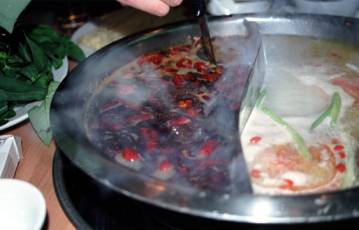 成都でもっともポピュラーかつ高級な火鍋専門店と思われる皇城老媽での二色火鍋である。鍋が二つに仕切られていて、片方にいわゆる四川独特の煮汁が入り、もう片方には豚骨や豚の胃袋などで取った白い出し汁である白湯(パイ・タン)が入っている。ご覧の通り、四川のそれは、四川原産の巨大な干しトウガラシのぶつ切りが大量に浮かんで、表面を覆っている。真っ黒いダシは、ショウユ、豆鼓がベースで、大量の粒山椒と、漢方薬系の香りがついている。ちなみに回りを見回すと客のほとんどは、この四川タレのみの鍋を注文していた。