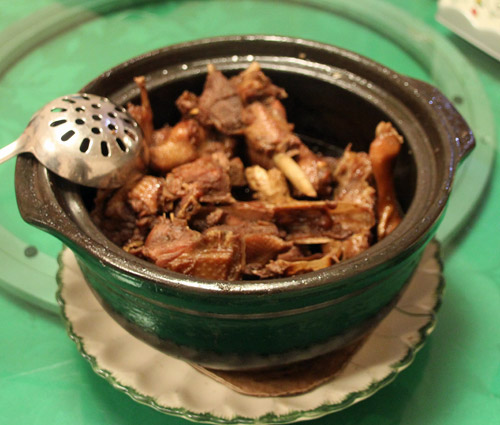 さあ、そうこうしているうちに、待望の料理が出始めた。まずは、これ、鴨のぶつ切り土鍋煮。前もって予約しないと出てこない特別料理だそうだ。写真では大きさが分からないかもしれないが、かなり大きな土鍋で、恐らく1羽まるまる入っている。ショウユと香辛料の香りがよく、ふたをして長時間蒸し煮して作ってあるので、肉の芯まで味がしみこんで、柔らかくて美味。