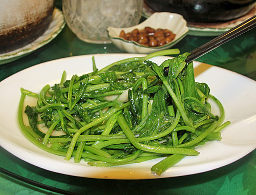 こちらは定番の青菜炒め。中国では箸休め的に必ずコースのあとの方で出てくる。定番どおり、ニンニクと共にあっさり塩味で炒め上げてある。これはちょうど小松菜のような味と食感だった。