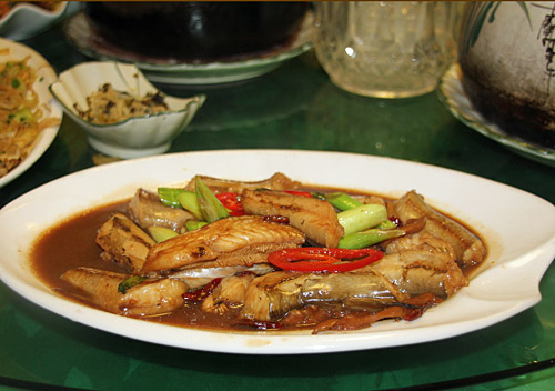 はい、これが最後の、豆腐のようにふるふるに柔らかい白身魚のショウユ煮。日本でいうとどうやらハゼのような魚らしい。ぶつ切りの青ネギと一緒に食べる甘辛い味、美味。