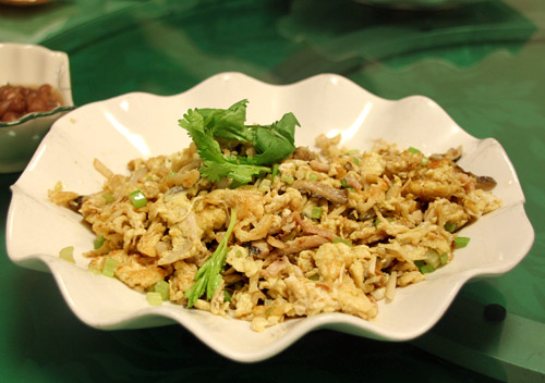 卵と魚の炒めもの。あっさりとした薄味で、香ばしくて、少し歯ごたえのある魚と、パサッとした柔らかい卵の食感がよく、おいしい。これもよくできた家庭の味といった趣である。