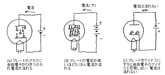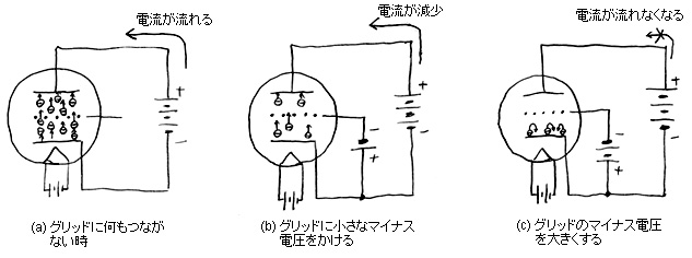 では、ここで、(b)のようにグリッドにカソードに対して小さなマイナスの電圧をかけてみる。すると、カソードから飛び出す電子はグリッドのマイナスと反発して妨げられ、結果、プレートに流れ込む電子の量が少なくなる。グリッドのマイナスの電圧を大きくするほど反発が強くなり、プレートへ到達する電子が少なくなって行く。グリッドのマイナス電圧があるところまで来ると、(c)のように電子はグリッドで全部はね返されプレートへ到達する電子がゼロになる。
