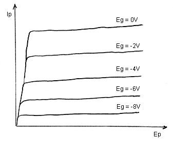 それでは、プレート電圧Epとプレート電流Ipのグラフはどうなるだろう。5極管では、スクリーングリッドに常に高圧がかかっているので、右図のように、プレートの電圧をちょっと上げるだけで電子が流れ始め、あたかもすぐに飽和するかのようなカーブを描く。グリッドにマイナス電圧をかけてもこの傾向は同じだが、電子の総量がマイナスの電圧のせいで減るので、プレートの電流は減る。結局、図のような曲線群になる。