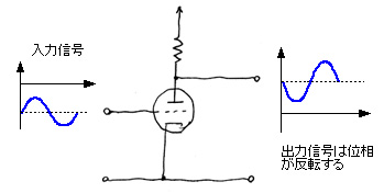 それから、この増幅回路のもうひとつの重要な性質として、信号の位相反転がある。ロードラインをよく見ると分かるのだが、グリッドにかける信号がプラスに振れると、プレート電圧は減少している。そのため、グリッドの信号とプレートに現れる信号は図のようにちょうど反転するのである。