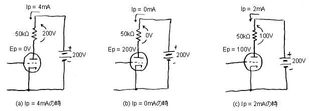 と計算できる(ちなみに、オームの法則は上の式のように、mAとkΩで計算するようにすると便利である) 電源電圧は200Vなので、この電圧はすべて抵抗の両端で使われてしまい、プレート電圧Epは0Vになる。そこで、このIp