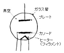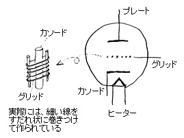 3極管は、右図のように2極管のカソードとプレートの間に、網状のグリッドと呼ぶ電極を入れたものである。これは模式図で、実際には極細の線を図のようにすだれ状に巻きつけたりして作られている。