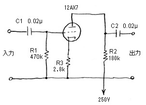 真空管の入力容量については、詳しくは他書に譲るが、5極管の場合、数pFでほとんど問題にならないが、3極管では数十から数百pFになることがあり要注意である。これまでに出てきた回路のようなカソード接地の場合、入力容量は真空管の増幅率が大きいほど大きくなり、12AX7で約100pF、12AU7で約20pF、2A3で約60pFぐらいの値である(ミラー効果と呼ばれる現象により、増幅率が大きいほど見かけの入力容量が増加する)。