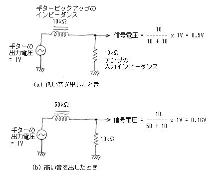 ギターのピックアップは知っての通り、磁石に細い線がものすごい数巻きつけて作られているので、これはコイルの塊である。原理編で言ったように、コイルは周波数が高くなるとインピーダンスが大きくなり周波数が低いと小さくなる。実際のギターピックアップのインピーダンスがどれぐらいかというと、周波数が高くなって行くにつれ、数kΩから数百kΩぐらいまで変化すると言われている。