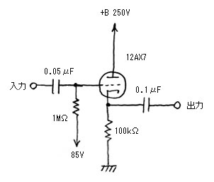 カソードフォロアは、真空管ギターアンプの回路図をネットでよく見ている人なら見かけたことがあるかもしれない。右の図のような形をしていて、特徴は、プレートに負荷抵抗が無く直接B電源につながっていて、カソードのところから信号を取り出す回路である。
