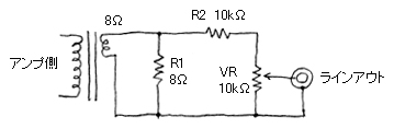 さて、お次はラインアウトだが、これもヘッドフォンのときとほとんど同じ右のような回路でできる。ラインアウトの場合、出力レベルが調整できないとちょっと困るのでVRを使っている。R2は出力を落とすための抵抗でここでは10kΩが入っているが、これも使いやすいように調整して決めればいいと思う。