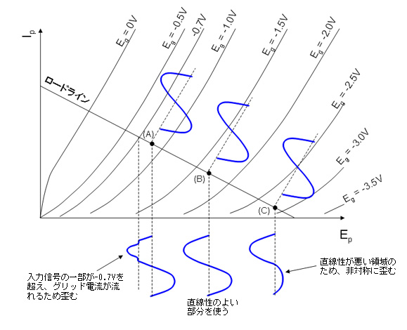 原理編で説明したように、A級増幅の様子は下の図のようになっていて、(B)のように直線性のよい真ん中辺を使うのがふつうである。(A)のように、あまりバイアス電圧を小さく(浅く)すると、信号のピークの部分がグリッド電圧のプラスの領域にかかってしまい、原理編で説明したようにグリッド電流が流れ、歪みの原因になる。グリッド電流はおよそ0.7Vぐらいから流れ始めるので、信号のピークが0.7Vを超えないようにバイアスを決める。このように、想定される入力信号電圧にも目安をつける必要があるわけだ。