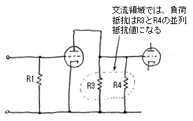 このように、ざっと考えてもいくつもの要因が関係しており、こうしないといけない、という決まりは無く、各々の妥協点の適当なところに落ち着くわけだ。下の図の回路では、次段のグリッドリーク抵抗R4が470kΩで、12AX7の内部抵抗は規格表から80kΩ(プレート電圧が100Vのとき)と書いてあるので、負荷抵抗R3を470kΩと80kΩの間の、たとえば180kΩと決めてもよいだろう。