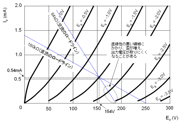 | 12AX7の負荷抵抗180kΩのロードライン |