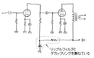 アンプの回路図を見ると、右の図のように電圧増幅段へ一種のCRフィルタを通して供給しているのが分かる。これは、電源回路の平滑回路と同じ形なのでリップル除去用のフィルタとして働くが、もう一つ大切な役目がある。それは、増幅回路の各段を分離するということで、これを