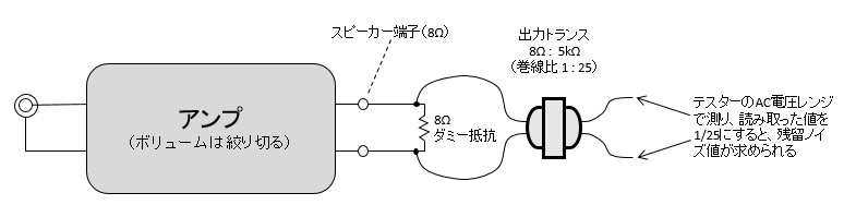 ダミーロードをつなぎ、ボリュームを絞りきって、そのときの出力電圧を測れば、それが残留ノイズ値である。ただし、1mVぐらいの小さい電圧になると、安物のテスターだとすでにAC電圧レンジの測定限界に達してしまうことがある。1mV以下のノイズ測定を追及したいのであれば、図のように、出力トランスを、スピーカー端子に逆に接続して、トランスの巻き数比による昇圧効果を利用して測定する方法がある。たとえば、図のように5kΩ:8Ωのトランス(巻き線比が25:1)であれば、テスターで測定した値を1/25にすれば求められ、かなりの精度で測定できることになる。前述のオーディオアンプを、このようにして測定したら0.5mVだった。ただし、これぐらいのオーダーになると、環境からの誘導ノイズを簡単に拾ってしまうので、線を極力短くしたり、シールドしたりしないと何を測定しているかわからなくなる恐れもあるので、目安ていどに考えておいた方が無難だろう。