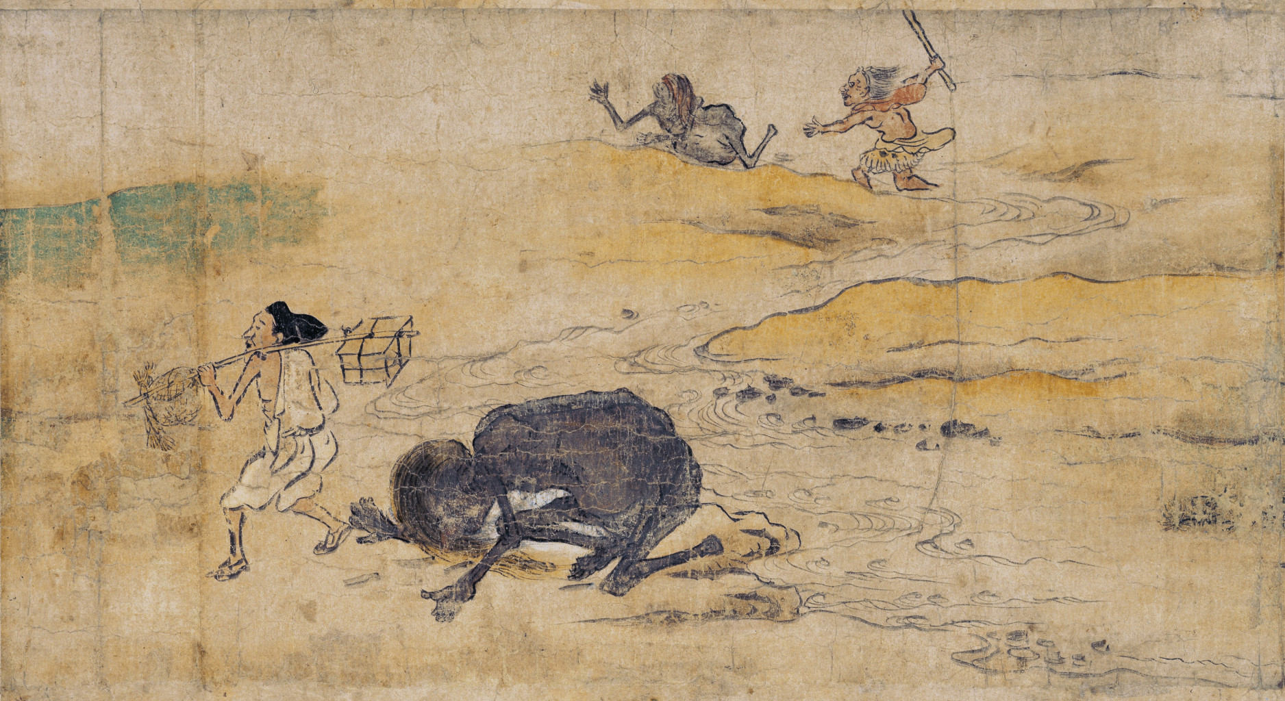 中央に川が蛇行していて、手前と向こうに餓鬼がいる。手前は旅人の後ろに這いつくばり、向こうの餓鬼は鬼に追いかけられている。詞書にはこうある。