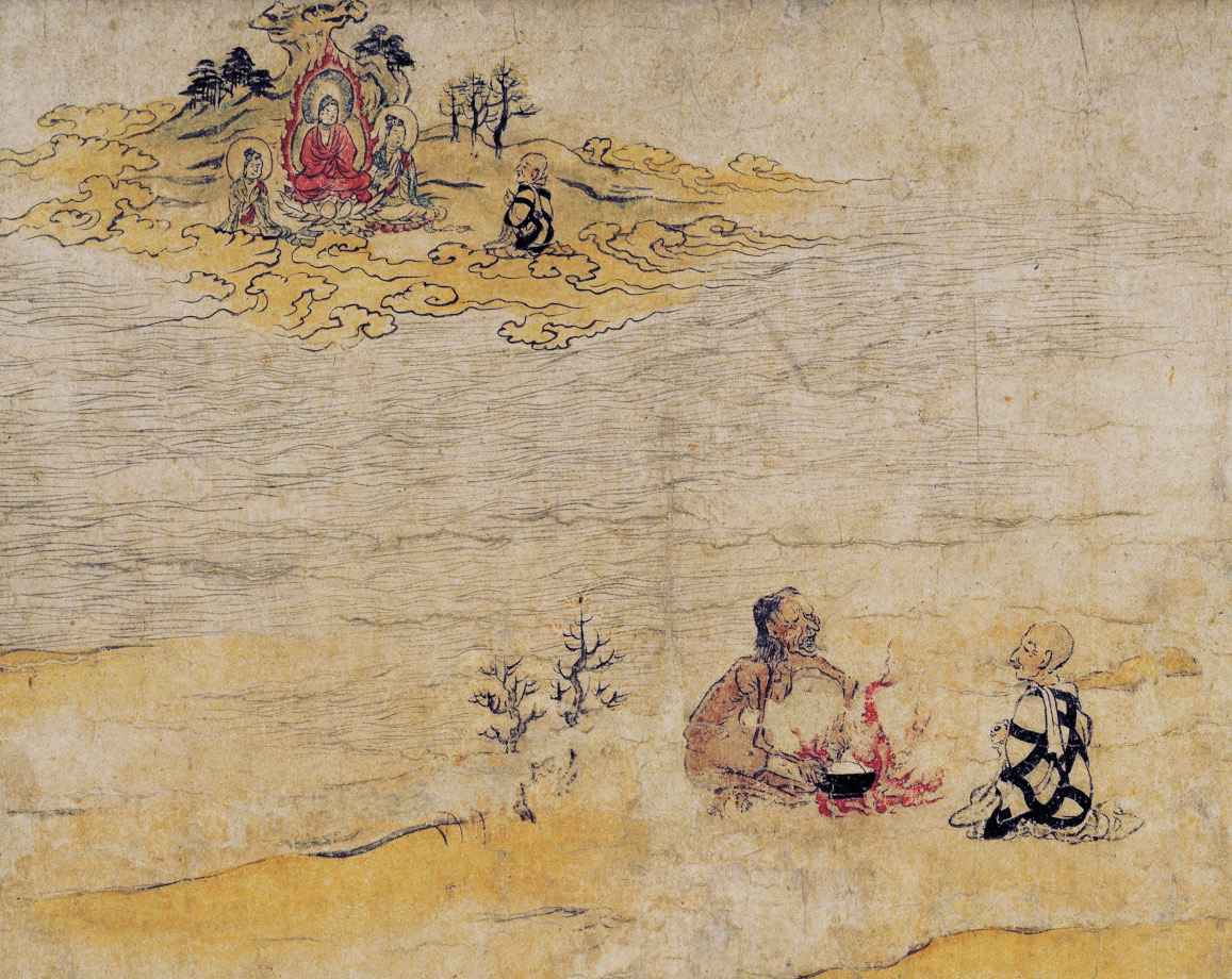 この絵は三つの順に起こる出来事が一つの絵の中に描かれている。右下に火に包まれた餓鬼がいて、左は佛に救けを求める餓鬼、そして真ん中上で餓鬼は人間の姿に変わり水が飲めるようになり、そしてそのまま右上の天上へと昇天してゆく。詞書にはこうある。