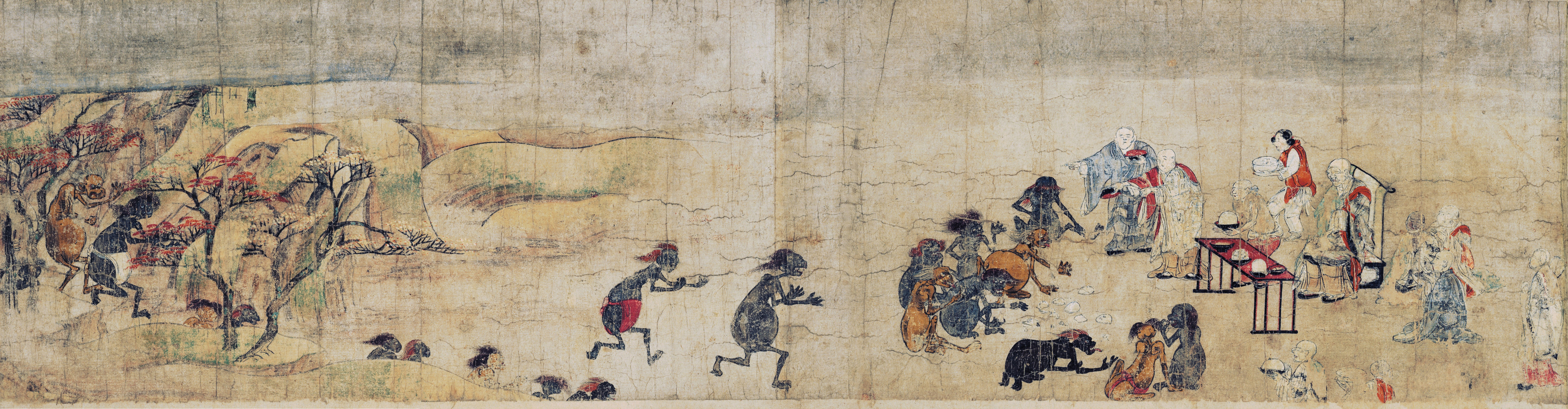 だいぶ横長の絵の右側におおぜいの僧がいて、おおぜいの餓鬼たちに食いものを与えている。詞書にはこうある。