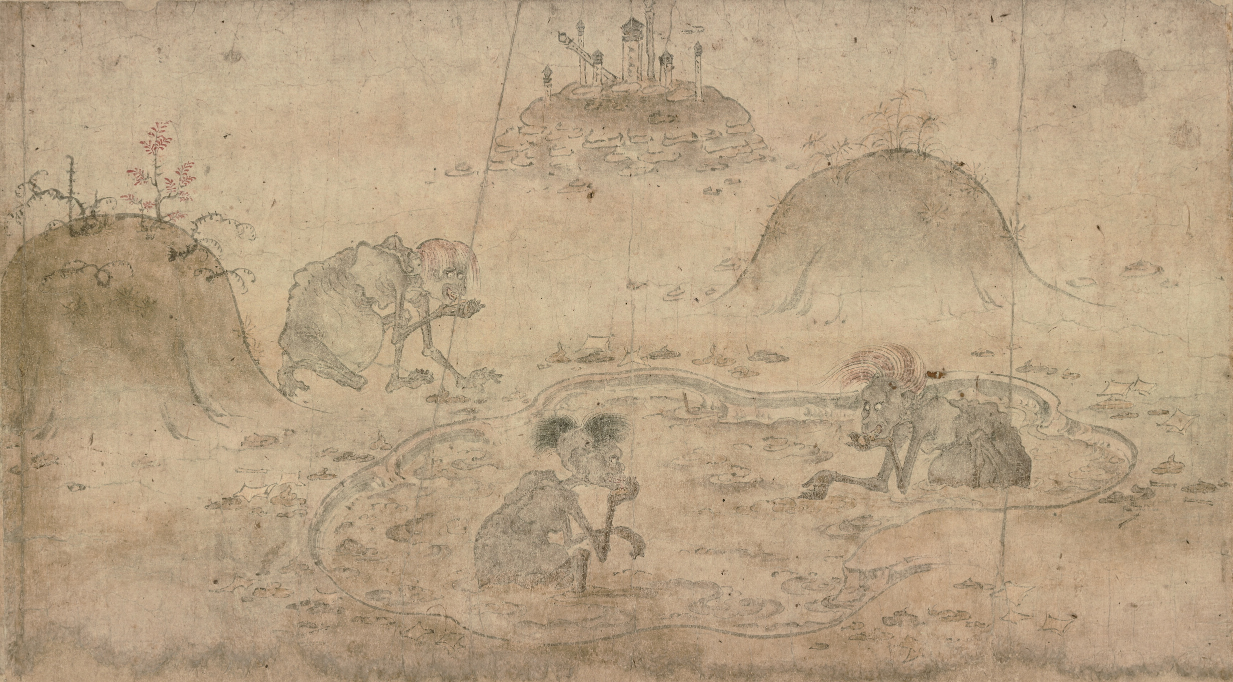 その糞の池に二匹の餓鬼が腰まで浸かって糞尿をむさぼり食っている。左上の三匹目は池の外に落ちた糞をすくって、なんとなく微妙な表情で口に運んでいるが、ようやく食べられるものにありつけた、みたいな嬉しなさけない感じの顔に見え、なかなか秀逸な表情である。