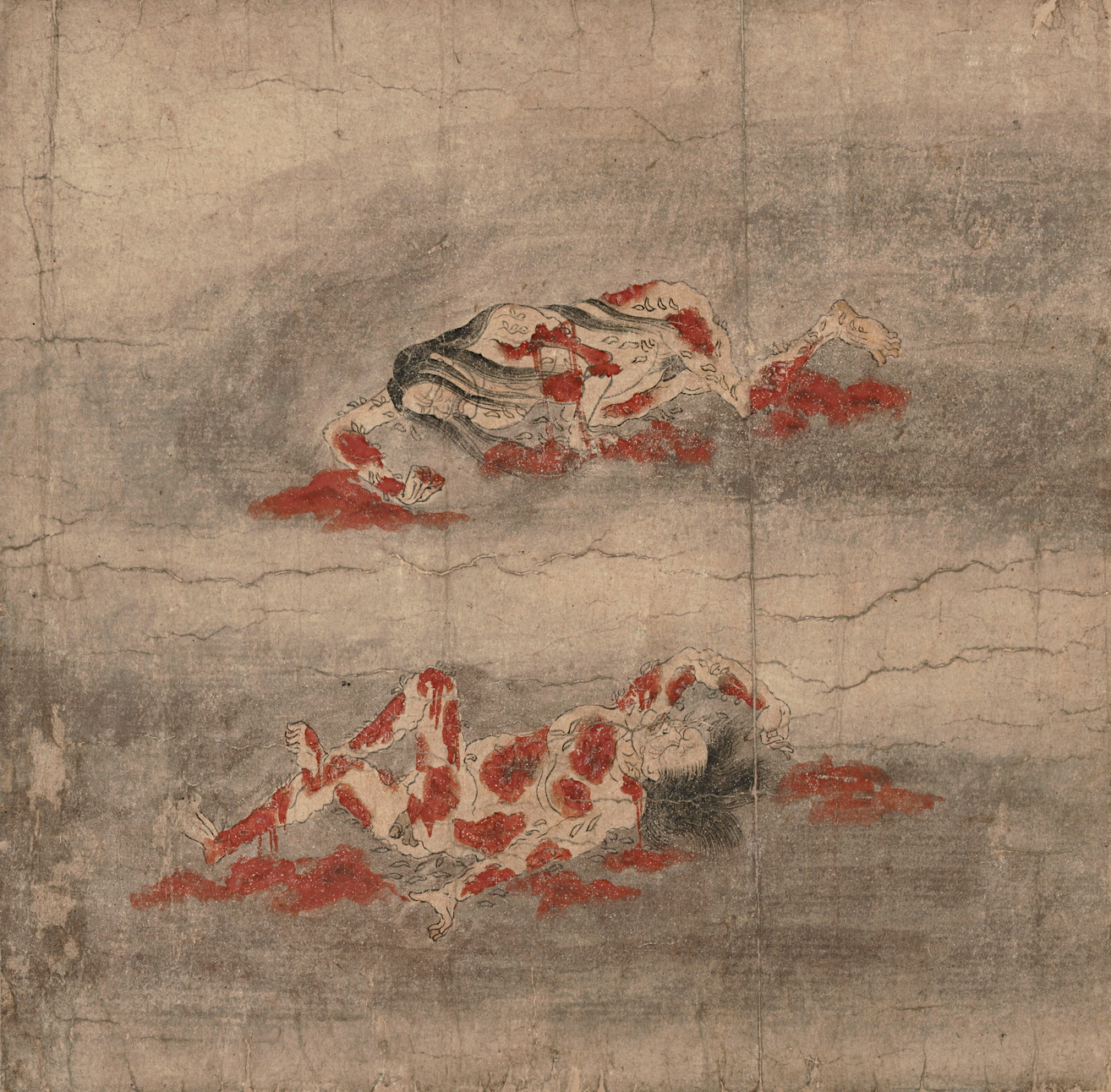 血の赤と髪の黒のコントラスト、そして、二体が入れ違いに描かれた構図がまことに秀逸である。ところで、酒を水増ししてこういう責め苦になるというのもおもしろい。この蛆虫は身体の中から湧き出て来るわけで、酒を薄めて人に売り与えたものは、飲まれたその酒の報いで、体の中から蛆に喰われるなどという連想につながるのであろうか。
