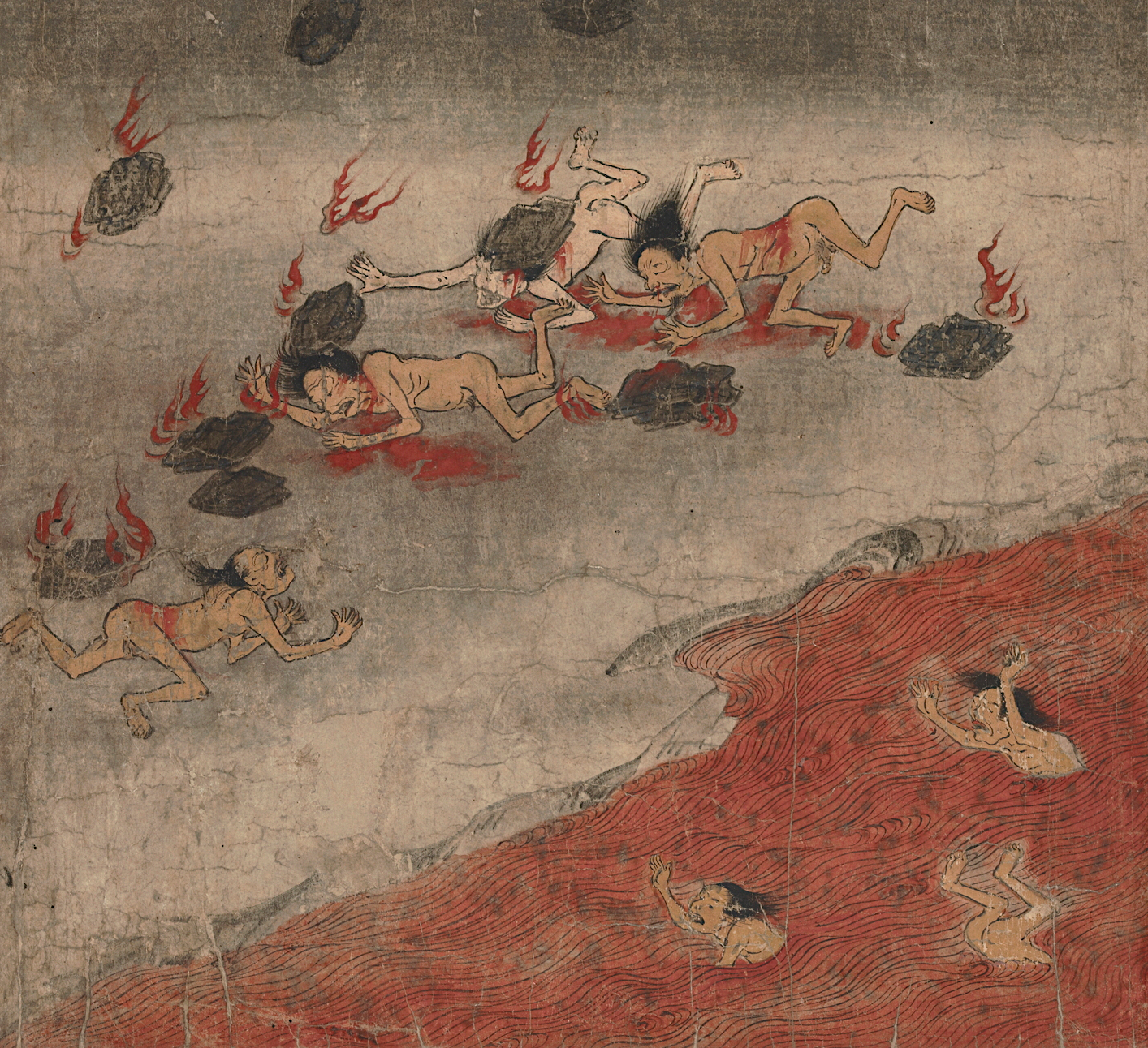 赤い河と白い岩場、落ちて来る黒い岩と、流れる赤い血のコンポジションがとても美しい。その中に、戯画化されたいかにもみすぼらしい体をした昔の日本人がさまざまな姿態で苦しんでいるようすがなんとも印象的である。