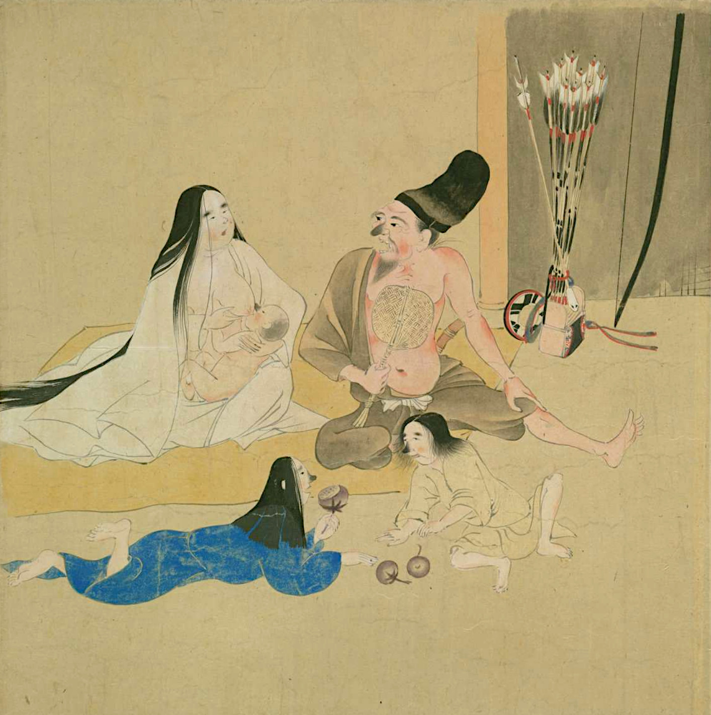 武士の男の一家の風景だが、男の鼻の頭が黒く、遊んでいる二人の子供も、乳を吸っている赤ん坊まで、鼻の先が黒い。ひとり母親だけがふつうである。詞書にはこうある。
