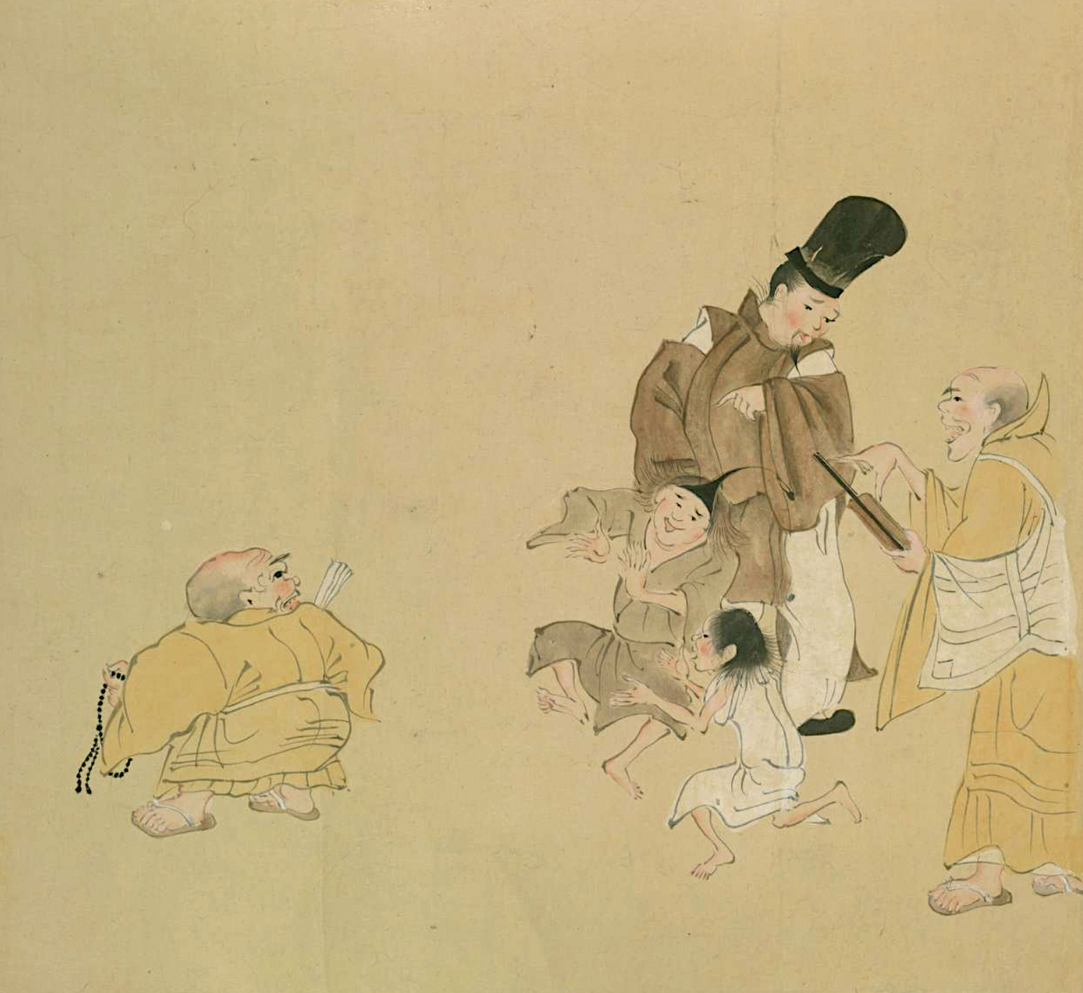 小人症の僧である。子供たちは笑ってはやし立て、侏儒の僧はそれに怒って振り返り、なにか言い返している。大人二人は宮仕えと坊主だろうか、やはり小人の僧を指さして、その小さな体でよく言うよ、という顔をしたり、笑ったりしている。詞書にはこうある。