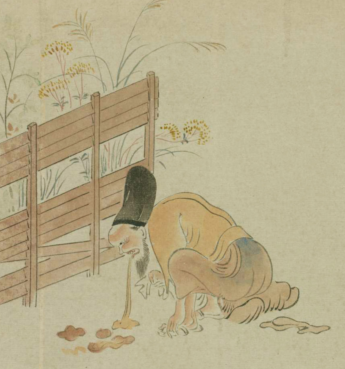 男がひとり、しゃがんで、孤独に糞を吐いている。詞書には