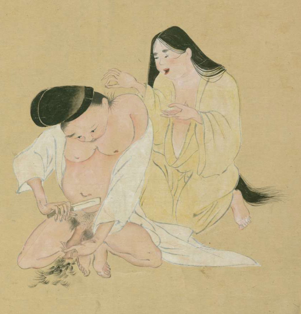 女の右手の指の形を見ると、どうやら、男の後ろに回って、頭の毛の根もとに食い込んでいる虱をつまんで、それを左手で受けているように見える。