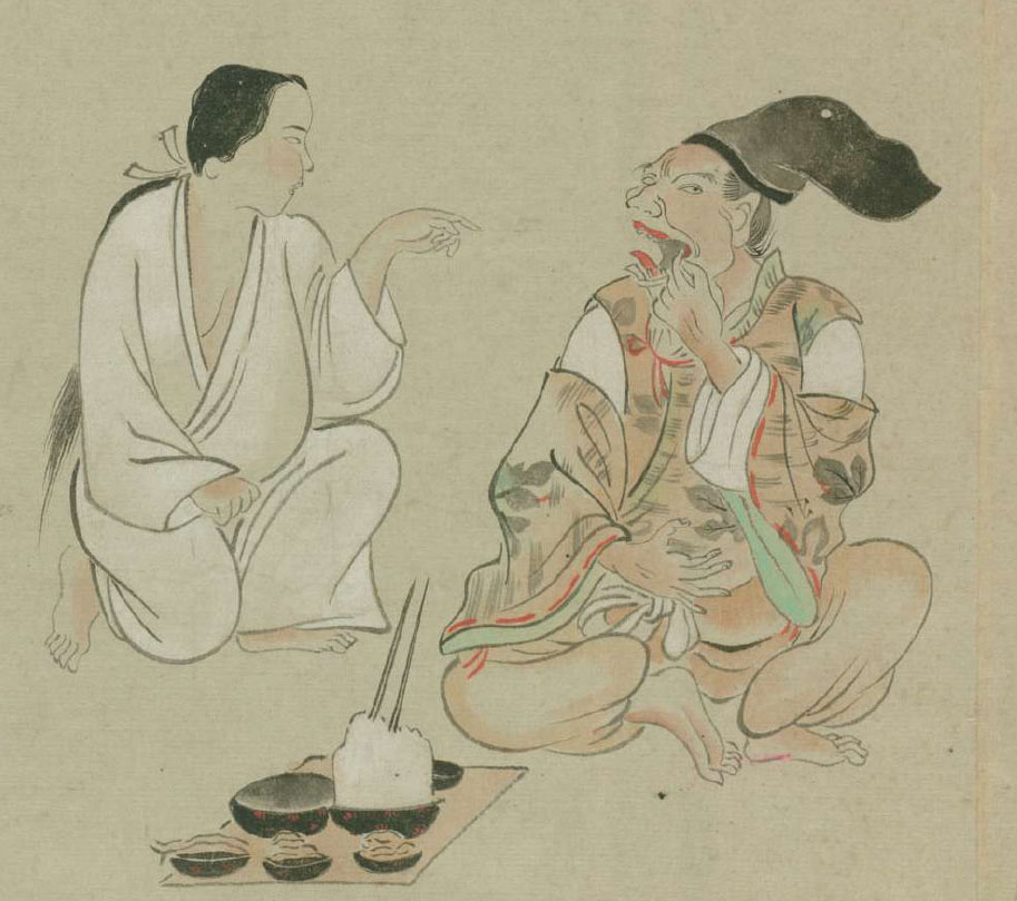 お膳がなかなか面白い。ごはんが山に盛られて、箸が突き刺さってる。左に汁もの。手前はおかず3品。いちばん左は、これは魚だろう。あとの二つは分からないけど、なんかの菜か漬物であろう。向こうの小皿には醤油とかが入っているようだ。このころはどうやら調理で味をあまり付けず、煮たり焼いたりした食材を、塩や酢、味噌醤油や酒に付けて食っていたそうなので、おそらく、それだろう。