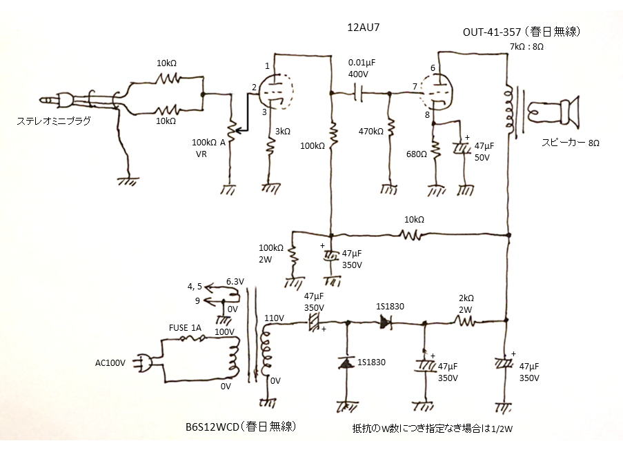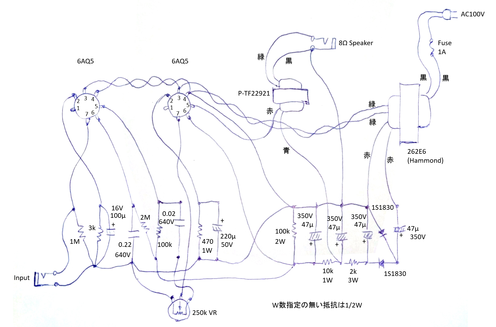 というわけで、その観点から見ても、6AQ5 – 6AQ5というのは素晴らしい並びでとても気に入った。パワー管をプリに使うのも面白い。というわけで、6AQ5を2本買うことにした。回路は、オーソドックスだけど、ほとんどFenderがまだFenderになる前に作っていたスティールギター用アンプを見習って、ボリュームもトーンも何にもないアンプにすることにした。音量はギター側で調整する。スイッチもなく、コンセントを入れれば音が出る。