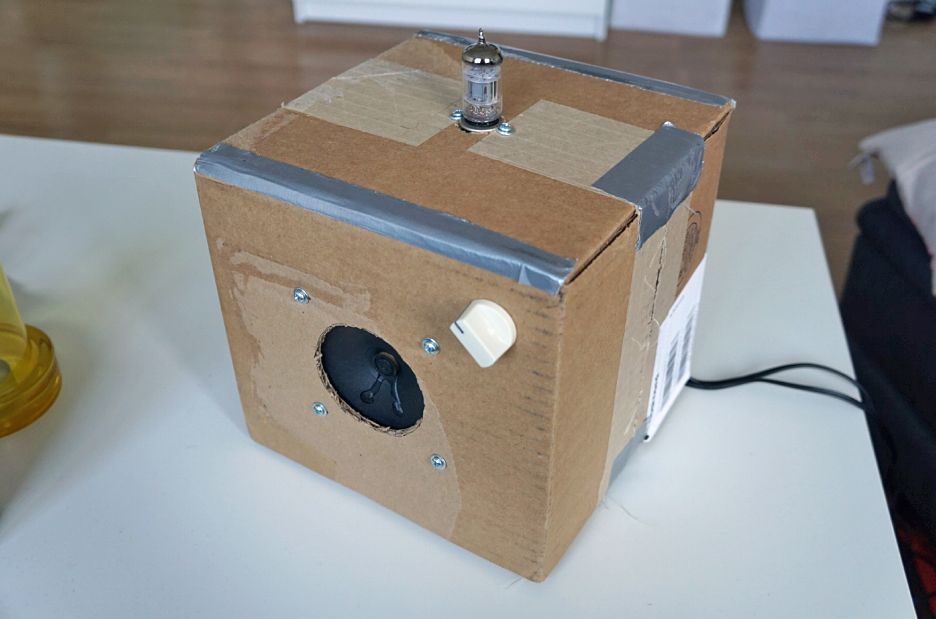 で、こっちに、かつてオーディオアンプ製作本の出版(コレです)のために作った、1球ダンボールアンプというものがあった。これは12AU7を1本使ったダンボールに組み込んだ0.2Wていどのモノラルオーディオアンプである。スピーカーも内蔵していて、なかなか可愛い。しかも、これが、けっこう素直ないい音がするのである。古いブルースとかかけると、けっこうしみじみする。