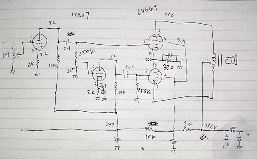 ま、見た目は6V6になっただけで一緒である。回路は以下の通りで、位相反転は一番アホっぽい古典式を採用している。わざと古臭い回路を使おう、という魂胆である。