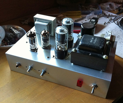さて、出来上がったアンプで弾いてみたんですが、回路がほとんど同じなので当たり前だけど、最初のバラックと同じ音で、いい音出てます。