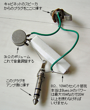 アンプから見た負荷は8Ωの固定抵抗、それでスピーカーは音量ボリュームで落とした電圧で鳴らすようにしている。こうすればスピーカー音量はかなり落とせる。全部をフルテンにしても音量は落とせるので、アンプでどんな歪み音になっているかを聞くことができる、というわけだ。