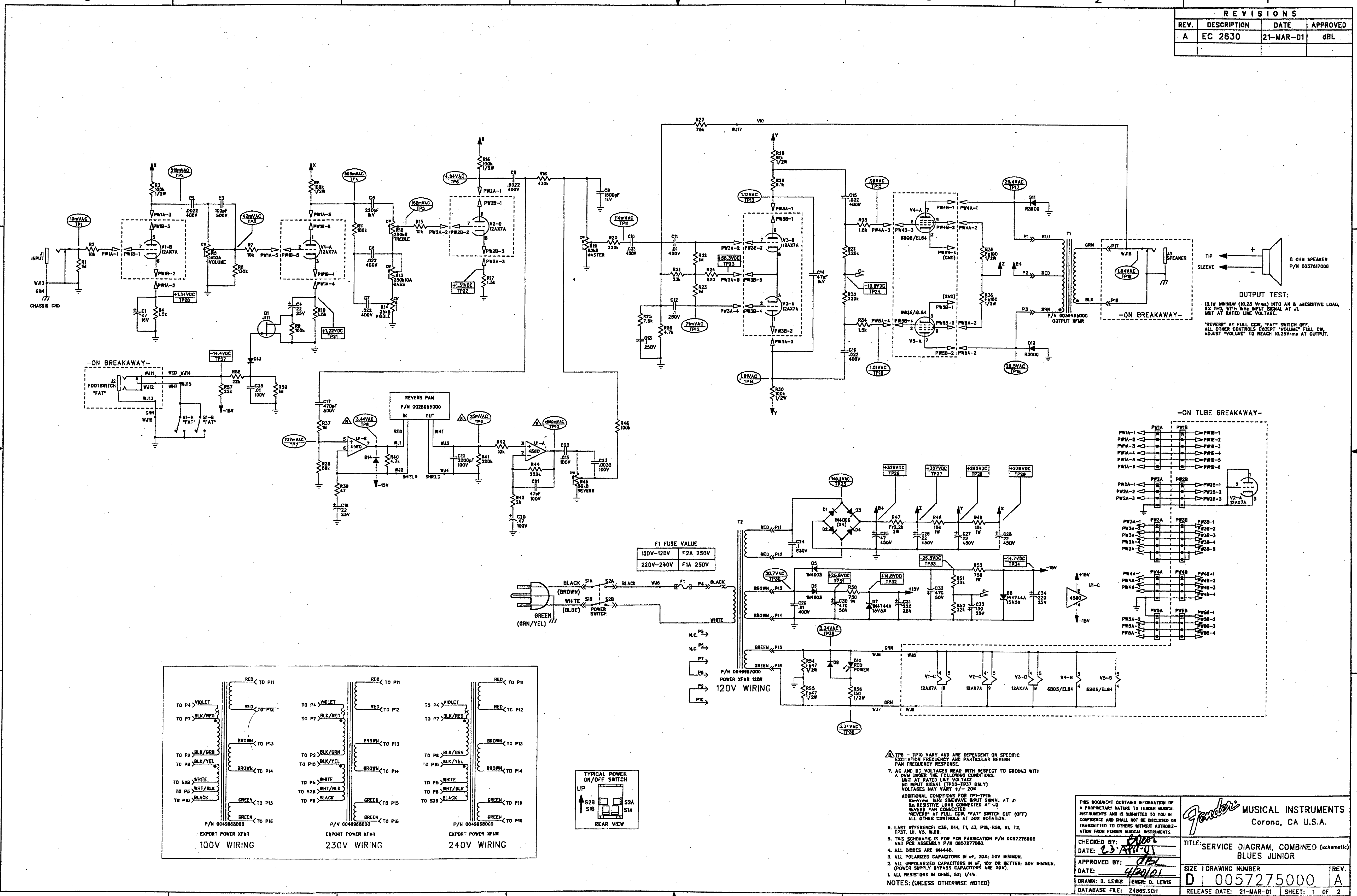 ためしにこの100pFを外してみると、音は劇的に変わり、なんだかそのへんのふつうのFenderのアンプを弾いてる感じである。とはいえ、さすがになんだかこもった音に聞こえてしまう。思うに、先の結合コンデンサの容量を小さくしたり、トーンコントロールのベースを落としたり、BRIGHT入りっぱなしにしたり、など、ブルースジュニアは全体に高音を強調する設計になっているようである。