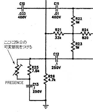 ここで、PRESENCE全開はギラギラすぎてイヤなので、高音だけでなく「全体に歪みっぽい感じを出したい」のであれば、半固定抵抗はR25の上側とグラウンド(C13の下側)に入れるといいかもしれない。まあ、とにかく、このへんは実際に音出ししながら試行錯誤が必要であろう。