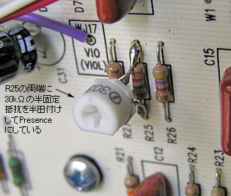 これで自由にPRESENCEを調整できるようになり、かなり快適なのだが、それなりに大変なので、とりあえず自分は、こんな風にしてみた。30kΩの半固定抵抗をR25の7.5kの両端に半田付けする、という方法である。当然、これは裏板を外した状態じゃないと回せないので、まったくイマイチだが、これを自分の好きな位置にしておき、その状態で使おう、というわけだ。基板上ではこんな感じである。