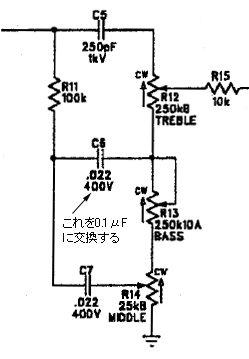 まずはBillmさんの「Tone Stack Mod」である。これは、BASSコントロールへ行っている0.022μFのコンデンサの値を0.1μFに変更する、というものである。これはたとえばPrinceton Reverbで使われている値なのだそうだ。