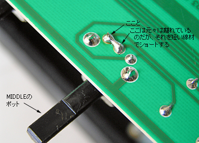 はい、お次は、Billmさんの「TwinStack Mod」である。トーンコントロールをFenderのTwin Reverbのタイプに変更する、というものである。これはけっこう簡単な改造で、トーンのMiddleのボリュームの一箇所をジャンパーでショートするだけである。Middleの裏側のところを下のように線でショートする。