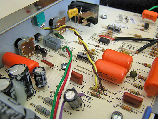 とにかく、そんなわけで、前回の秋葉で購入したPRESECE CONTROL用の小VRの取り付けと、通販で購入した電解コンデンサーによる電源フィルターコンデンサの正規増量をライブ前の駆け込みで前日に決行した。
