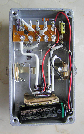 中の配線を平ラグ版を使ったものに変えて、さら線材に太い単線を使い、強度と音の抜けをよくしようなどという変更である。あと前回までのヤツは部品もありあわせのものだったけど、今回は抵抗とコンデンサにちょっとだけ良いもの使ってみた。加えて、ペダルを踏んだときのインジケータのLEDも付けておいた。外装はほとんど同じくで以下である。